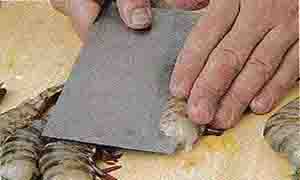 4.片成蝦肉片 剝?nèi)ノr頭及蝦身的殼,留下蝦尾,用刀從蝦腹切開至背部但不切 斷,片開后內(nèi)側(cè)蝦肉用刀背將蝦筋略砍一下,可避免油炸或蒸煮時蝦身卷曲。 |